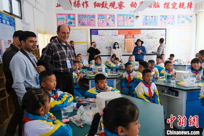 图为5月18日上午,参访团成员在林芝市第二小学观看孩子们上实验课。中新社记者 江飞波 摄