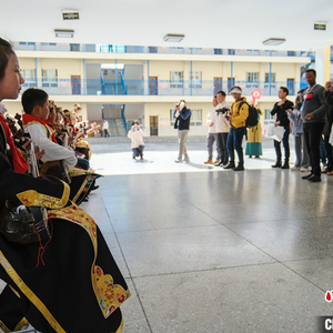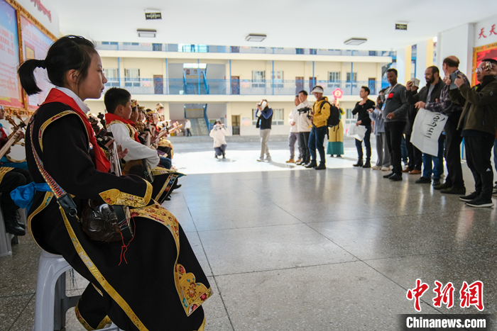 进入校园后,欢快的扎念琴声传来,十多位孩子聚在一起弹奏着。一曲表演完毕,现场掌声热烈。