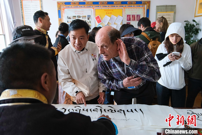 图为5月18日上午,参访团成员柯马凯(Michael Crook)侧耳倾听藏文书法老师的讲解 中新社记者 江飞波 摄