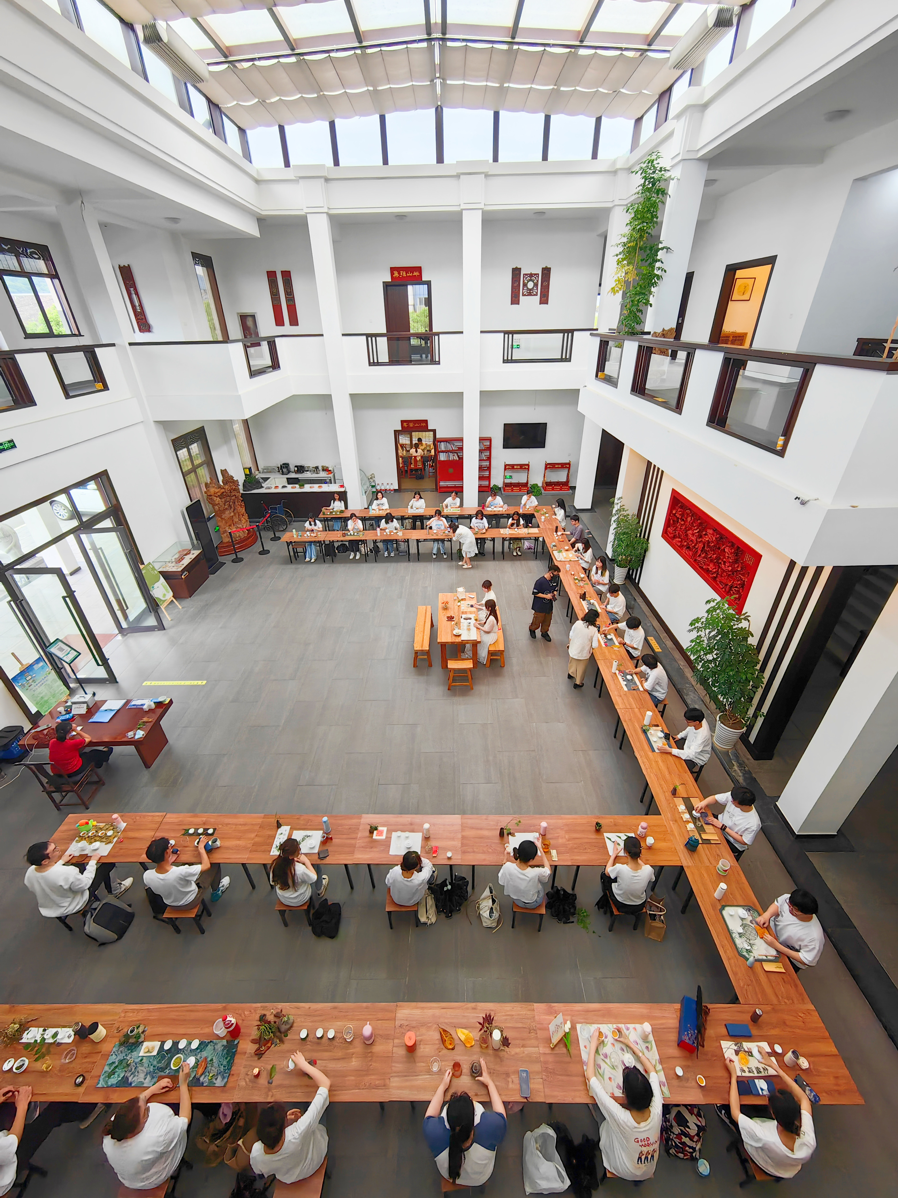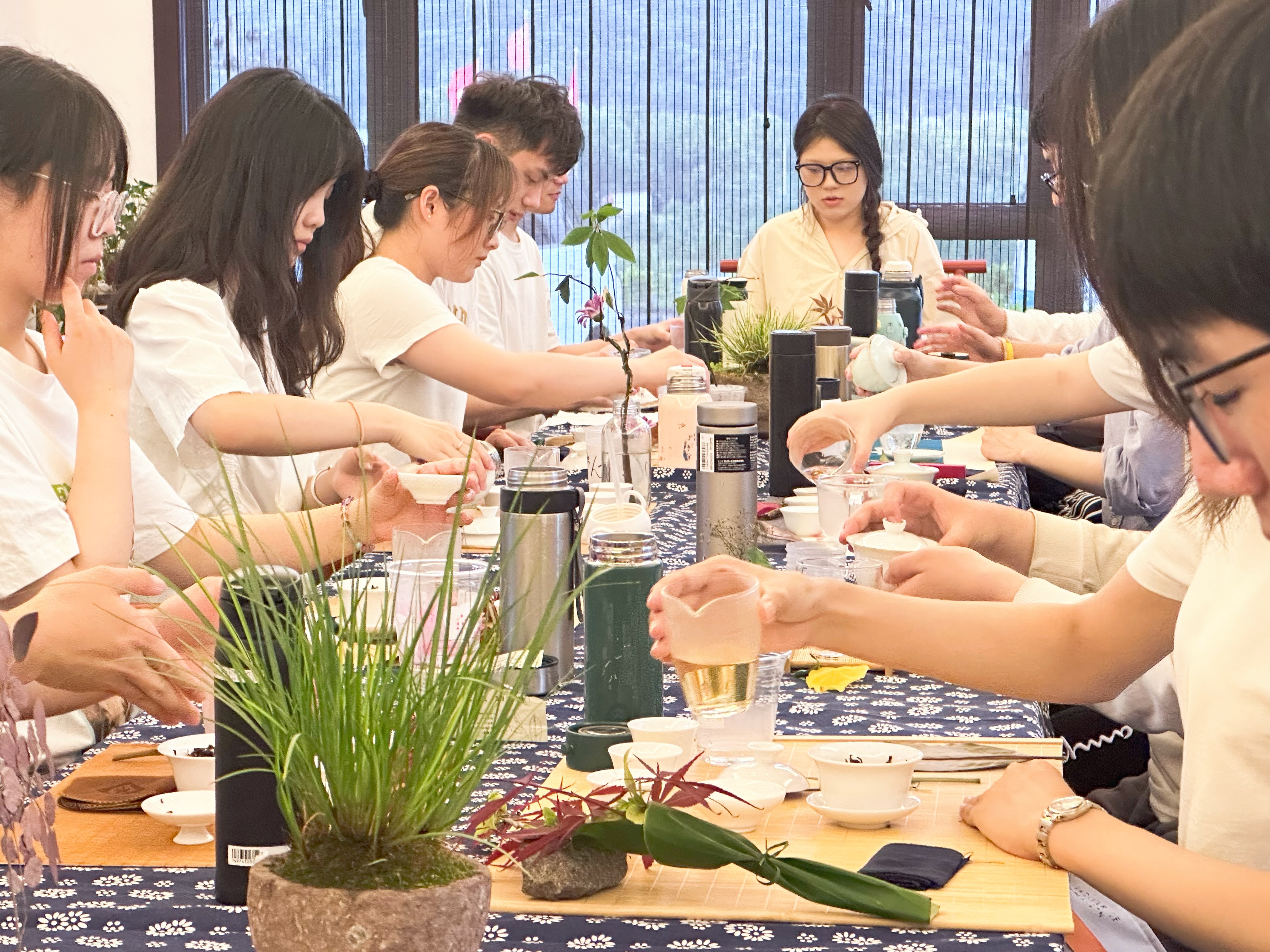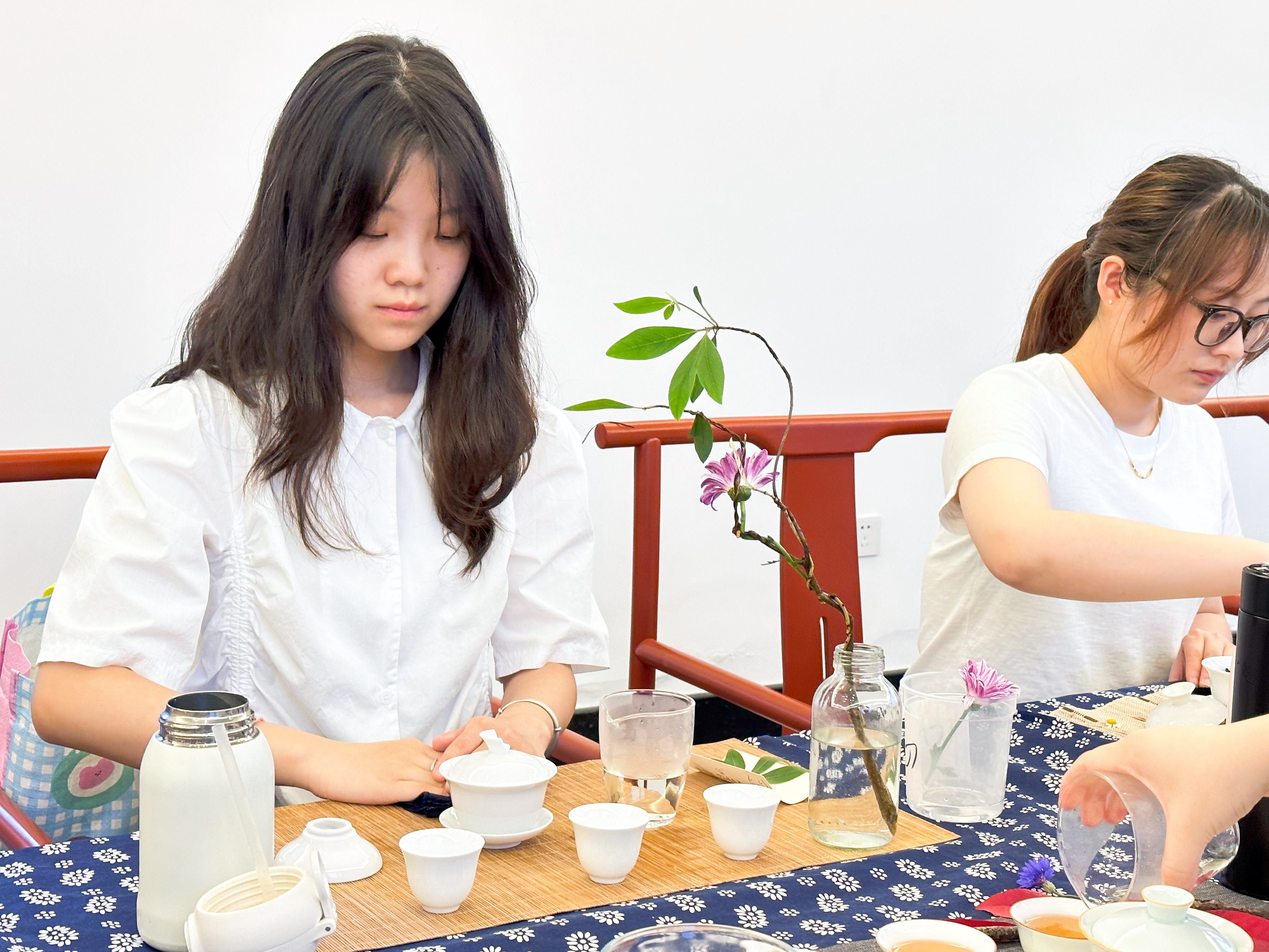 清新素雅的蓝印花桌布上摆放着原木色的茶垫,素白色的茶具配以形态、风格各异的茶席花,淡淡的茶香弥漫在空气中,柔美空灵的中国风纯音乐《空》更是平添了一份别样的意境……这副景象不是在茶艺馆,而是宁波财经学院的茶道选修课的考试现场。临近期末,任课老师裴秀颖把期末考试的考场搬到了宁波朱金漆木雕艺术馆,学生们考试只需自带一只保温杯和一套盖碗旅行套装。