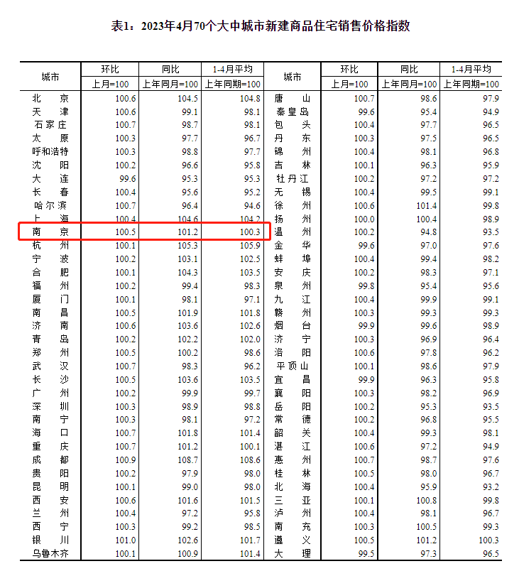 5月17日,国家统计局发布《2023年4月70个大中城市商品住宅销售价格变动情况》,数据显示,4月南京新房价格环比上涨0.5%,同比上涨1.2%,二手房价格环比下跌0.1%,同比下跌0.3%。这是继今年2月以来,南京新房价格连续第3个月上涨。