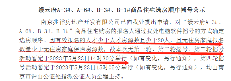 据南京石城公证处消息显示,项目因有效报名的人才少于人才房源数且少于20人,且无住房家庭报名数量少于无住房家庭保障房源数,故本次无第一轮、第二轮摇号。第三轮摇号活动暂定于2023年5月23日14时30分举行。