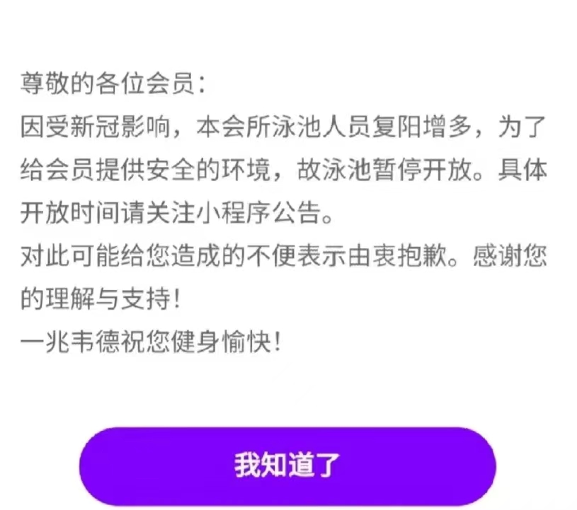 以一兆韦德香逸湾会所为例,该会所泳池自5月20日起关闭。香逸湾会所在公告中将泳池关闭的原因归结为“近期新冠复阳影响,泳池员工调配困难”。