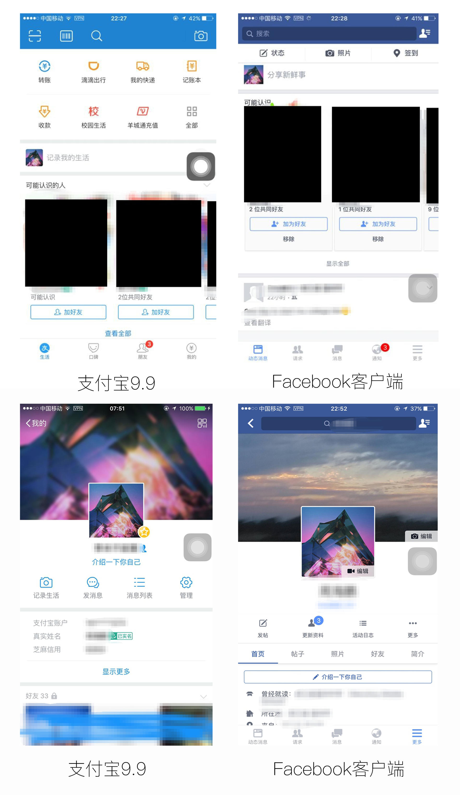 今年8月10日,支付宝9.9版本正式上架APP Store。打开的瞬间,有种熟悉感,似乎看到了Facebook。打开首页,可以发现发布动态、好友推荐,以及信息流显示方式基本上是一致的。不禁想起支付宝9.0版本的时候几乎是把微信“像素级”地搬了过去。但并没有达到预期。