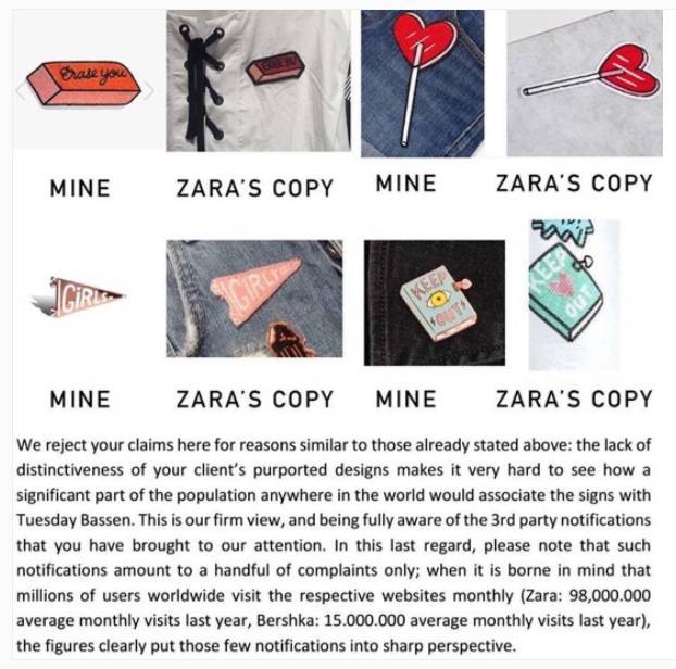 她委托律师联系 Zara,Zara的回应是:“……我们拒绝你方申诉,理由上文已提及:你的设计并不独特,很难想象,世界上任何一个地方会有多少人将其与 Tuesday Bassen 联系在一起。”Zara以抄袭起家,这不是它第一次陷入抄袭丑闻。