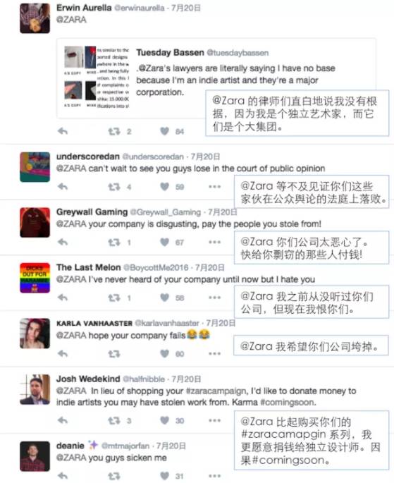Zara 官方 Twitter 账号 7 月 19 日网友评论