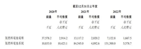 国鸿氢能在招股书中称,其年收入的波动主要由氢燃料电池电堆及氢燃料电池系统的销量及平均售价变动导致。据悉,国鸿氢能氢燃料电池电堆的平均售价已从2020年的2914.2元/KW降至2022年的1667.5元/KW,氢燃料电池系统的平均售价也从2020年的10423元/KW降至2022年的5578.7元/KW。