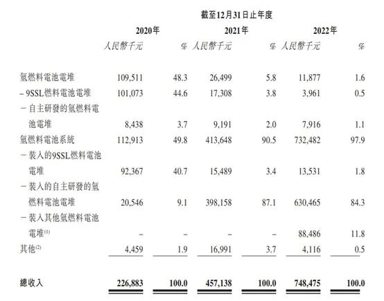 由于业务与产品变化,国鸿氢能在2020年至2022年,氢燃料电池堆的收入由1.1亿元降至1187.7万元,营收占比由48.3%降至1.6%。而同期,国鸿氢能氢燃料电池系统的收入从1.13亿元增长至7.32亿元,营收占比从49.8%升至97.9%,其中装入国鸿氢能自研氢燃料电池堆的氢燃料电池系统在2022年的营收达到6.3亿元,总营收占比达到84.3%。
