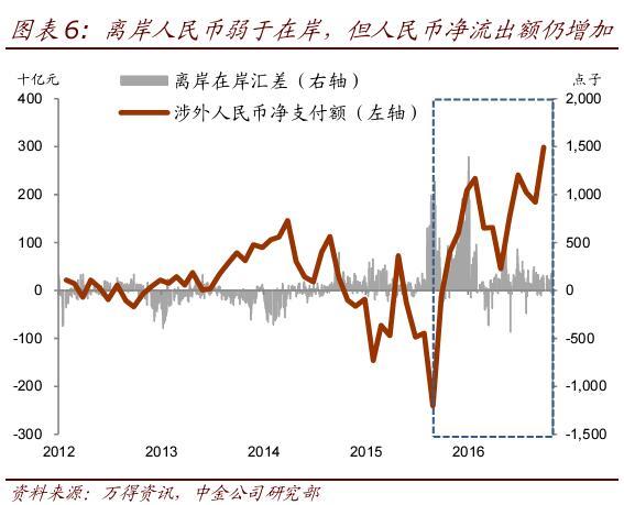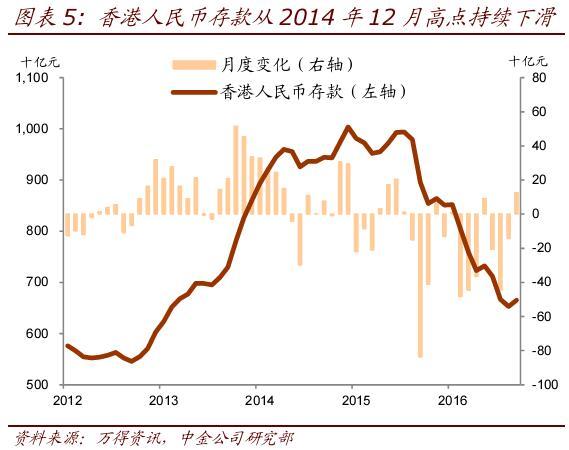 流出的人民币并未形成离岸人民币资产。从历史数据看,在去年9月之前,人民币对外净支付额与香港人民币存款呈现同步、同向变化,表明流出的人民币相当一部分转化为了离岸人民币存款。但这种关系似乎已不复存在:去年10月以来,在人民币净流出加速的同时,香港离岸人民币存款却在快速萎缩,从去年9月底的8,954亿元下降了25.7%(2,299亿元)至今年9月底的6,655亿元(图表5)。根据我们的不完全统计,其他离岸中心人民币存款同期也下降了至少1,393亿元。自去年10月以来,境外共发行了人民币债券822亿元,而债券存量实际减少了383亿元。总体来看,离岸人民币资产规模是收缩的。