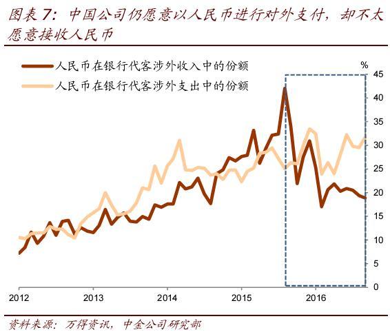 人民币流出可能已成为资本外流的重要通道。自去年811汇改以来,离岸人民币汇率一直弱于在岸汇率,而且一度较为显著,而两地利差扩大很大程度上已是汇差的反映(图表6)。离岸人民币并不比在岸人民币更有吸引力——即便是有,也应看到离岸人民币存款等资产增加。因此,套利机制似乎不足以解释人民币的加速流出。我们认为,在人民币贬值预期挥之不去而在岸外汇管理趋严的情况下,人民币流出可能已成为规避外汇管理、实现资本跨境并最终转为外汇资产的重要渠道。在过去一年间,人民币在银行代客涉外支出中的份额继续攀升,而在涉外收入中的份额却大幅下降。这种分离在历史数据中并不多见。如果没有理由认为境外市场参与者在人民币贬值预期下更愿意接收人民币,那么这可能是资本漏出的一个间接印证(图表7)。