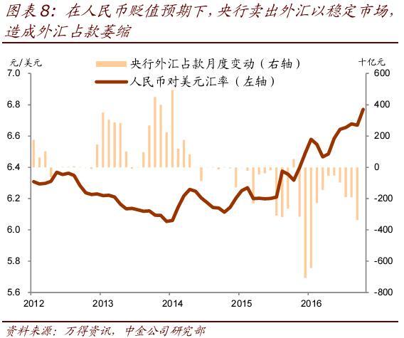 人民币流出也会使汇率承压或导致外汇储备下降。当私人部门向境外输出人民币并在离岸换汇,离岸人民币供给增加,人民币汇率必将承压。在汇率联动机制(如预期趋同)的影响下,在岸汇率也将受到一定的拖累。若要抵消该影响,央行必须在离岸市场卖出美元、回笼人民币。这一干预措施可稳定汇率,但将消耗外汇储备。因此,人民币流出亦会导致汇率贬值或外储下降,与外汇流出并无二致(图表8)。