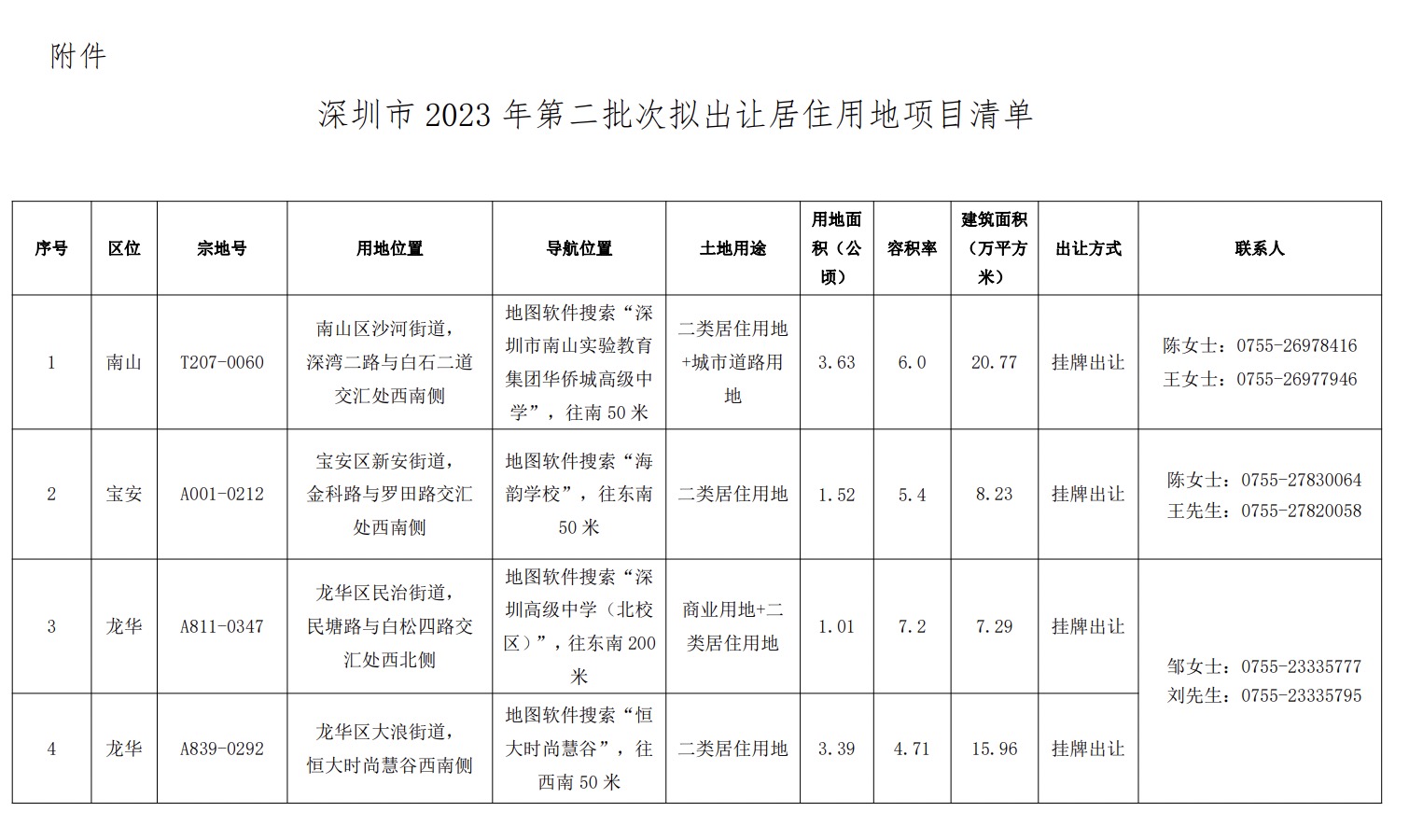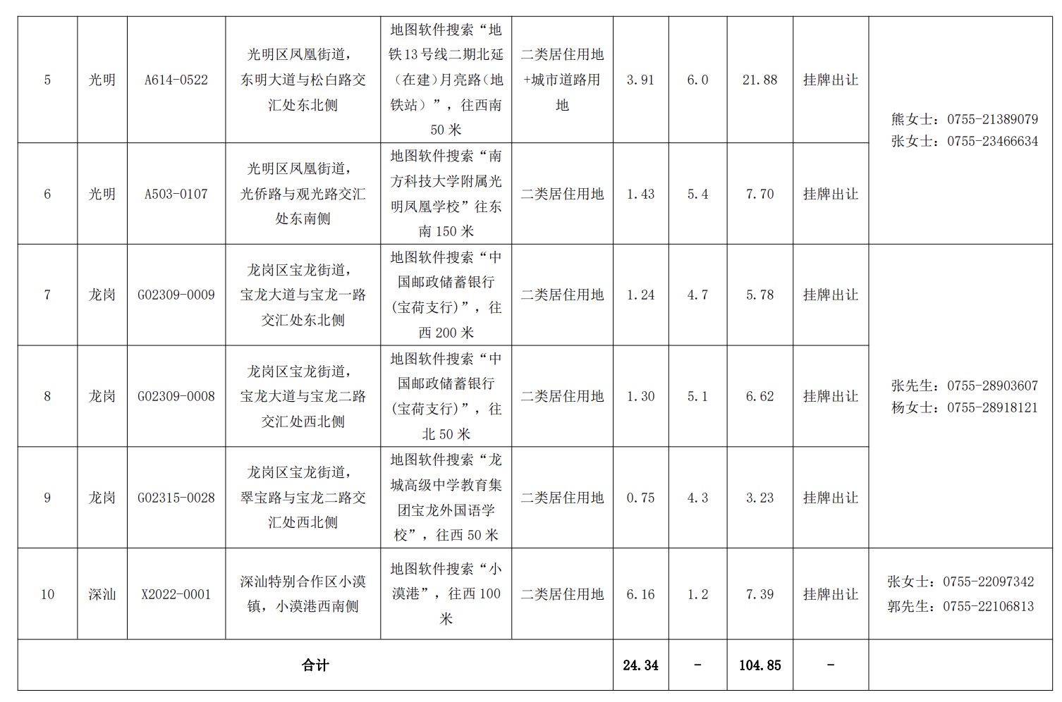 5月24日,深圳市规划和自然资源局发布2023年第二批次拟出让居住用地项目清单。清单共包括10宗涉宅地块,用地面积总计24.34公顷,建筑面积共计104.85万平方米,根据公告,清单内地块将于2023年5月25日至2023年8月25日期间发布出让公告。从区位看,南山区1宗、宝安区1宗、龙华区2宗、光明区2宗、龙岗区3宗、深汕特别合作区1宗。