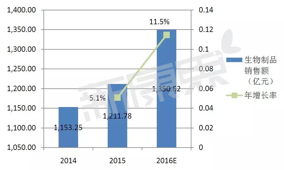 目前,中国生物制品市场容量相对较小,据中康CMH监测,2015国内生物制品用药总体规模为1211.78亿元,在国内药品市场中占比8.15%,同比2014年增长5.1%。随着生物技术的进步,国家政策的推进,生物制品的发展在医药行业中呈上升趋势,在整个药品市场中的份额稳步增长。预计2016年市场规模将以11.5%的增速达到1350.62亿元,在国内药品市场中占比9.16%。