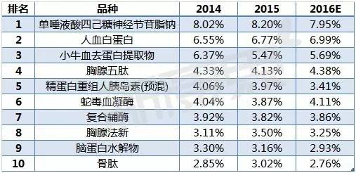 2015年脑蛋白水解物销售额达38.31亿元,市场份额占比3.16%,同比增长0.58%。在脑蛋白水解物的所有生产企业中,排名前三位的分别是云南盟生药业、哈三联药业、山西普德药业,三家企业累计占据64.94%的市场份额。