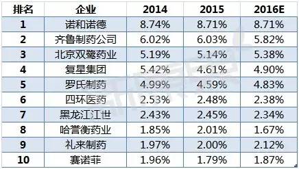 蛇毒血凝酶属于血液和造血系统用药,可用于减少流血或止血及预防出血。2015年用药金额达46.86亿元,市场份额占比3.87%,同比增长0.58%。在蛇毒血凝酶的所有生产企业中,排名前三位分别是蓬莱诺康药业(巴曲亭)、北京康辰药业(苏灵)、复星集团(邦亭),年销售额均超10亿,累计占据蛇毒血凝酶83.98%的市场份额。