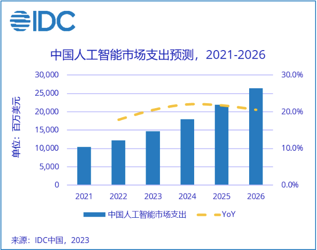IDC数据显示,2023年全球人工智能支出将达到1540亿美元,同比增长26.9%,到2026年AI相关产业规模支出将超过3000亿美元,2022-2026年的复合年增长率将达到27%。人工智能领域的新一轮发展热潮正在席卷全球。