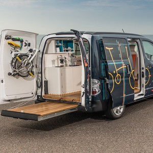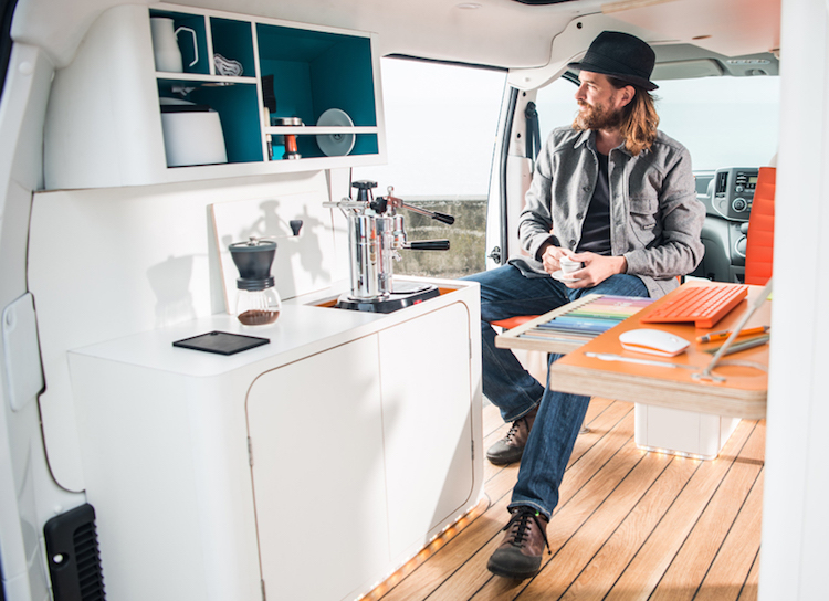 这个独立办公空间被设置在日产的E-NV200电动汽车中,办公必需品一应俱全:桌椅、台灯、手机充电接口、咖啡机、橱柜,还有放满啤酒的冰柜,一辆折叠自行车,和车后方可以随时折叠收起的木板。