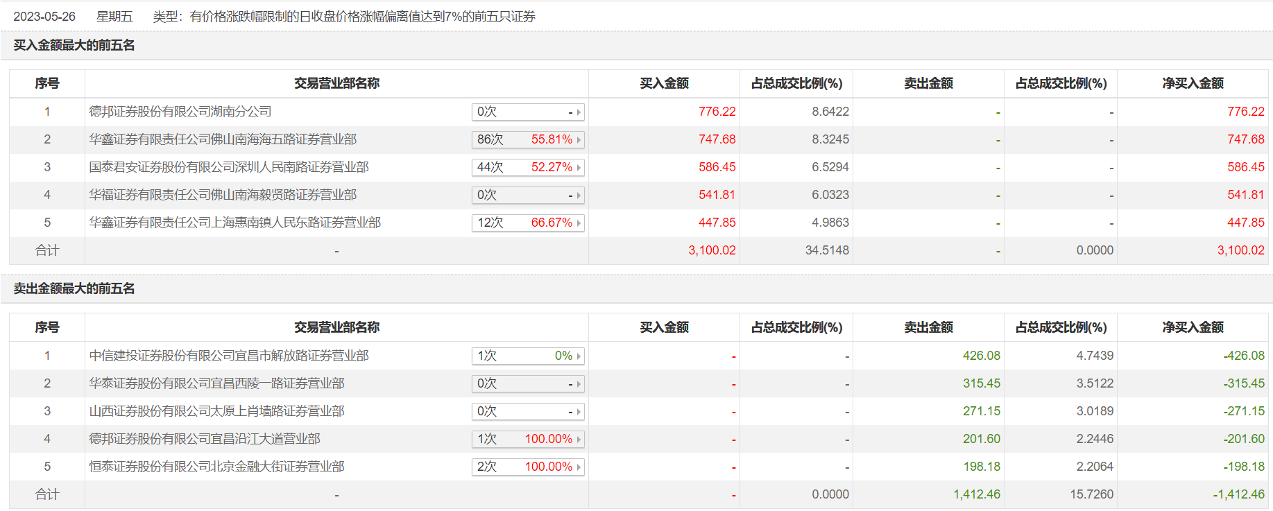 具体来看,德邦证券湖南分公司、华鑫证券佛山南海海五路证券营业部分别买入776.22万元、747.68万元;中信建投证券宜昌市解放路证券营业部、华泰证券宜昌西陵一路证券营业部分别卖出426.08万元、315.45万元。