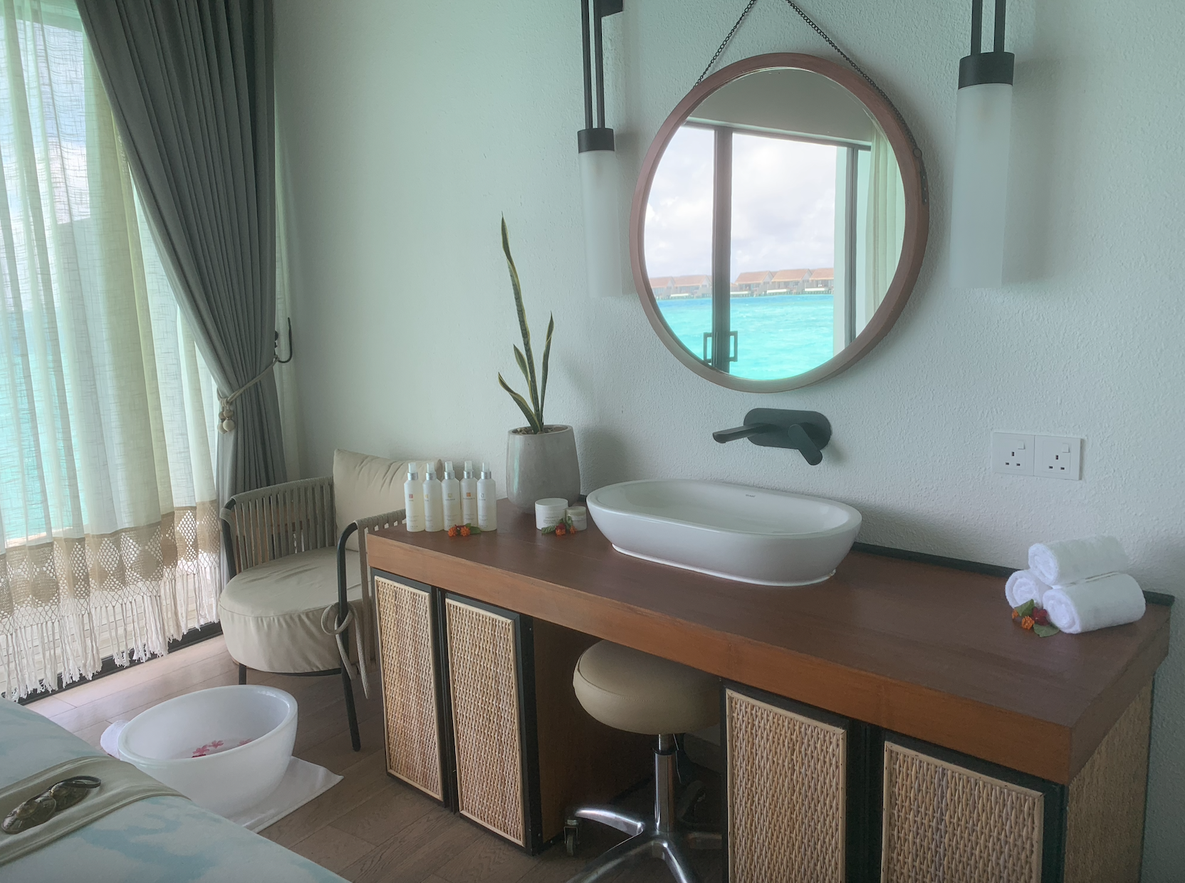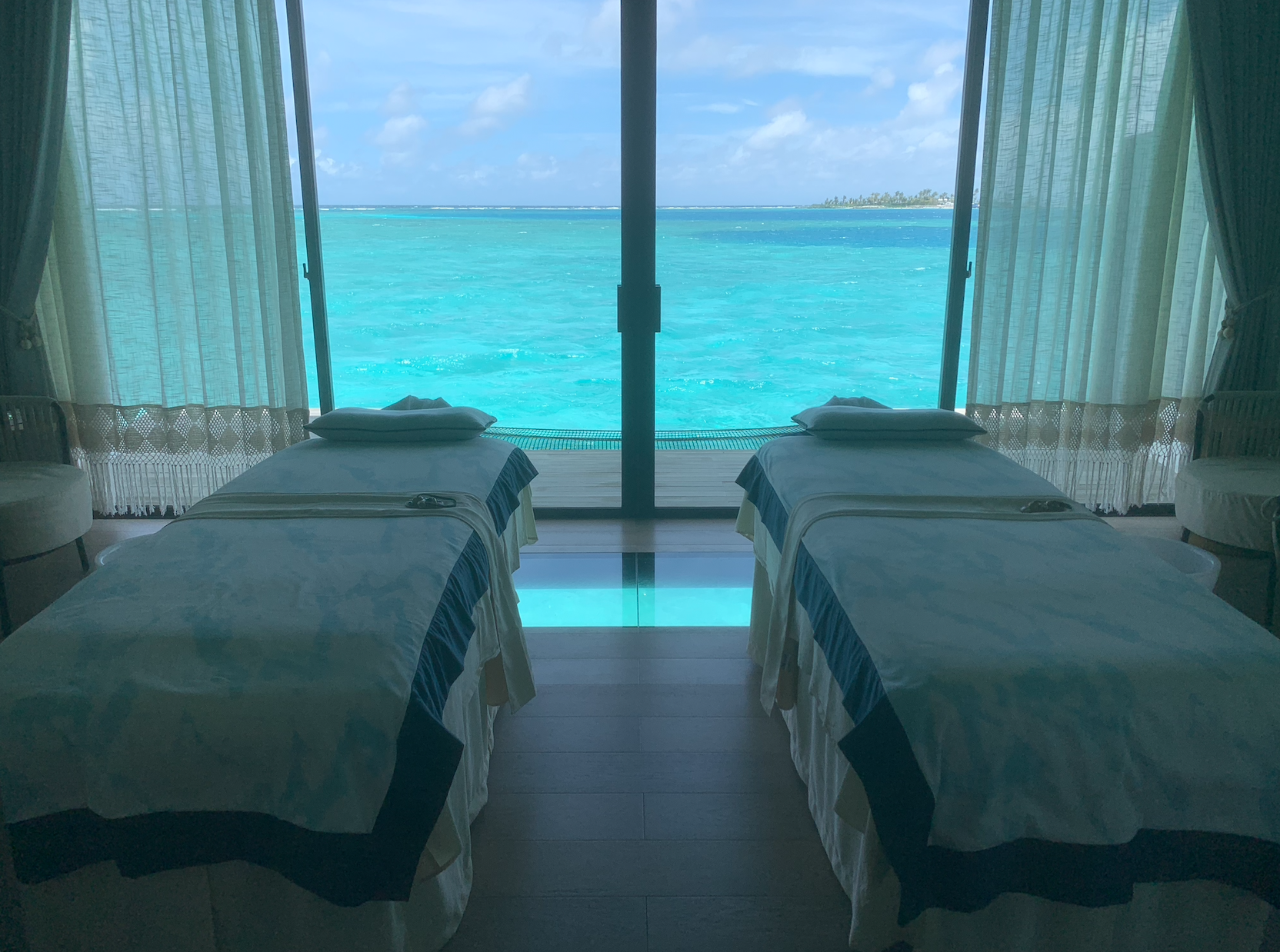 阿敏吉里水疗中心提供焕活水疗和特色项目蒸汽浴护理,面向按摩床趴下的瞬间,趴脸垫将透明玻璃地板下的大海猝不及防地怼到眼前,是颅内会打出一长串惊叹号的时刻。体验完spa可以移步水上甲板Skye,这里提供现场喷洒植物精华的健康茶饮,全身心放松地迎接海风的轻抚,感受大自然神奇的疗愈力量。