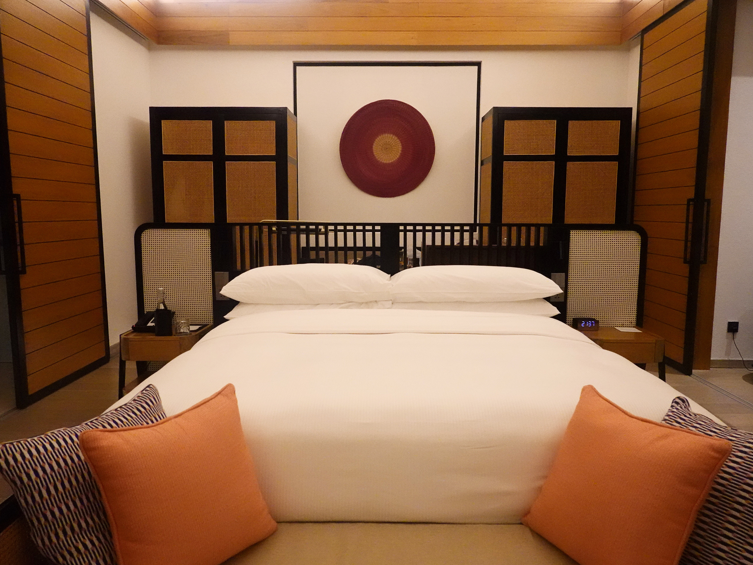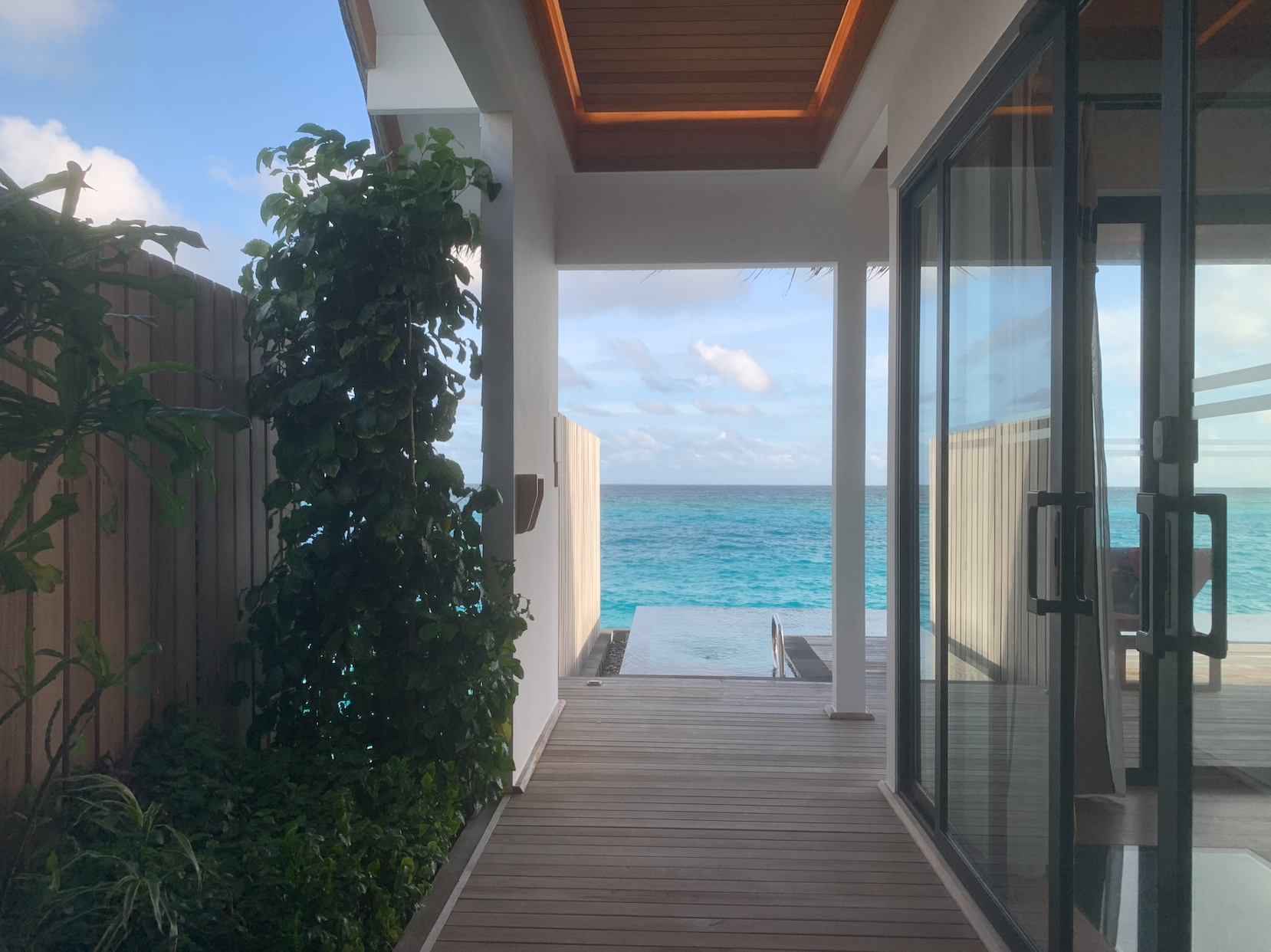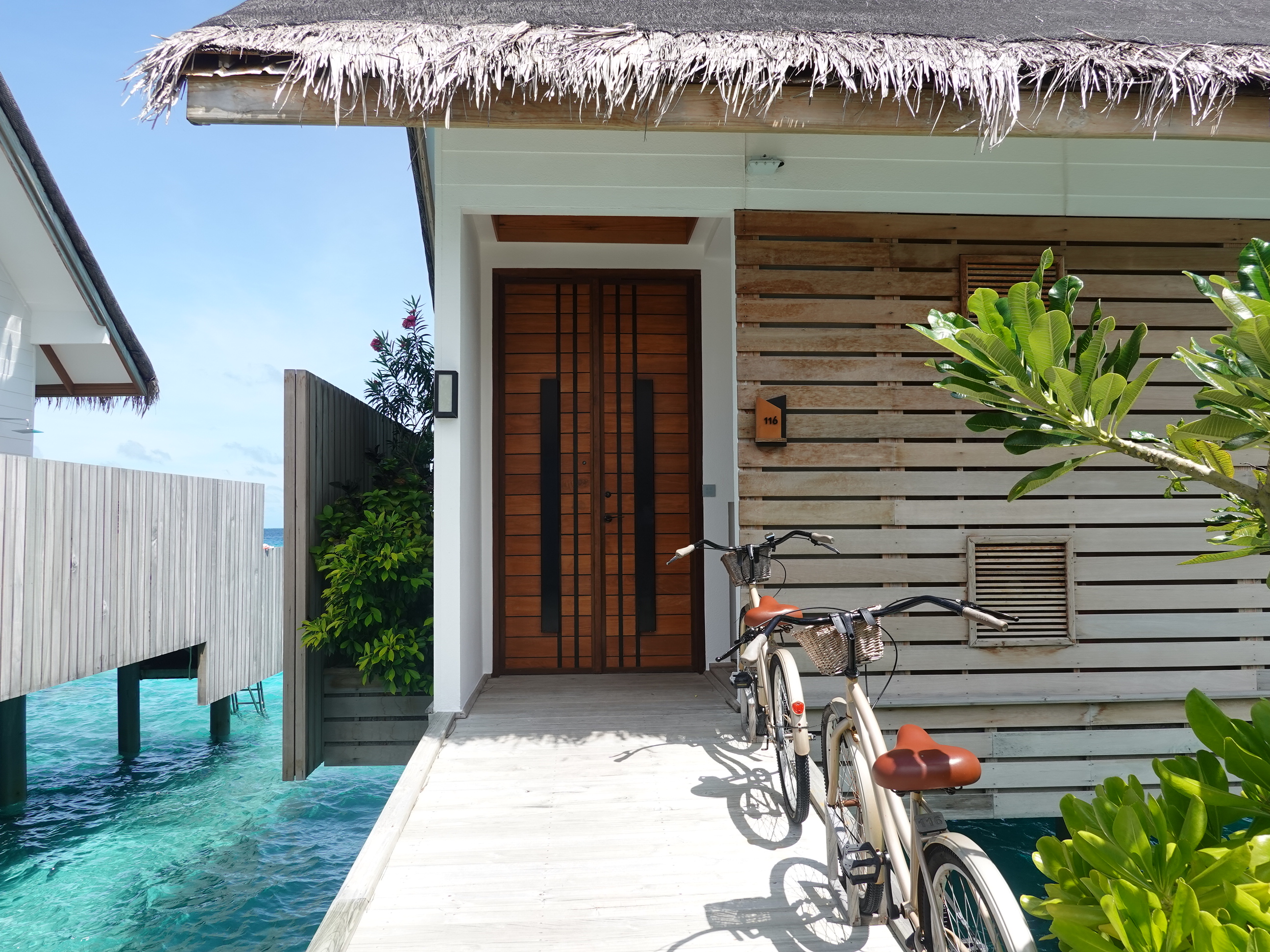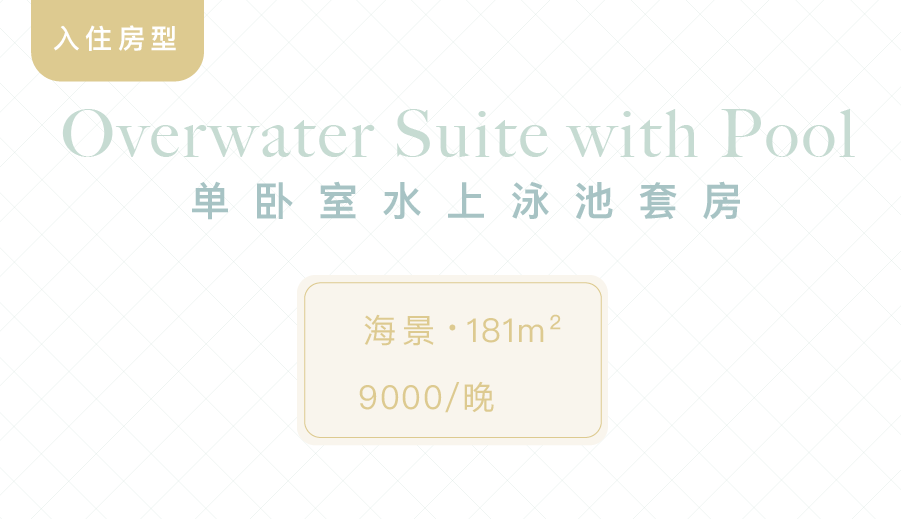 阿敏吉里的109栋别墅可以分为水屋和沙屋两大类别,共有单卧室水上泳池别墅、单卧室沙滩泳池别墅、单卧室水上泳池套房、双卧室水上泳池别墅、双卧室沙滩泳池别墅和最大的阿敏吉里别墅六种房型,房型从138㎡起跳。本次入住的是单卧室水上泳池套房,面积达到181㎡,别墅之间有大海相隔。