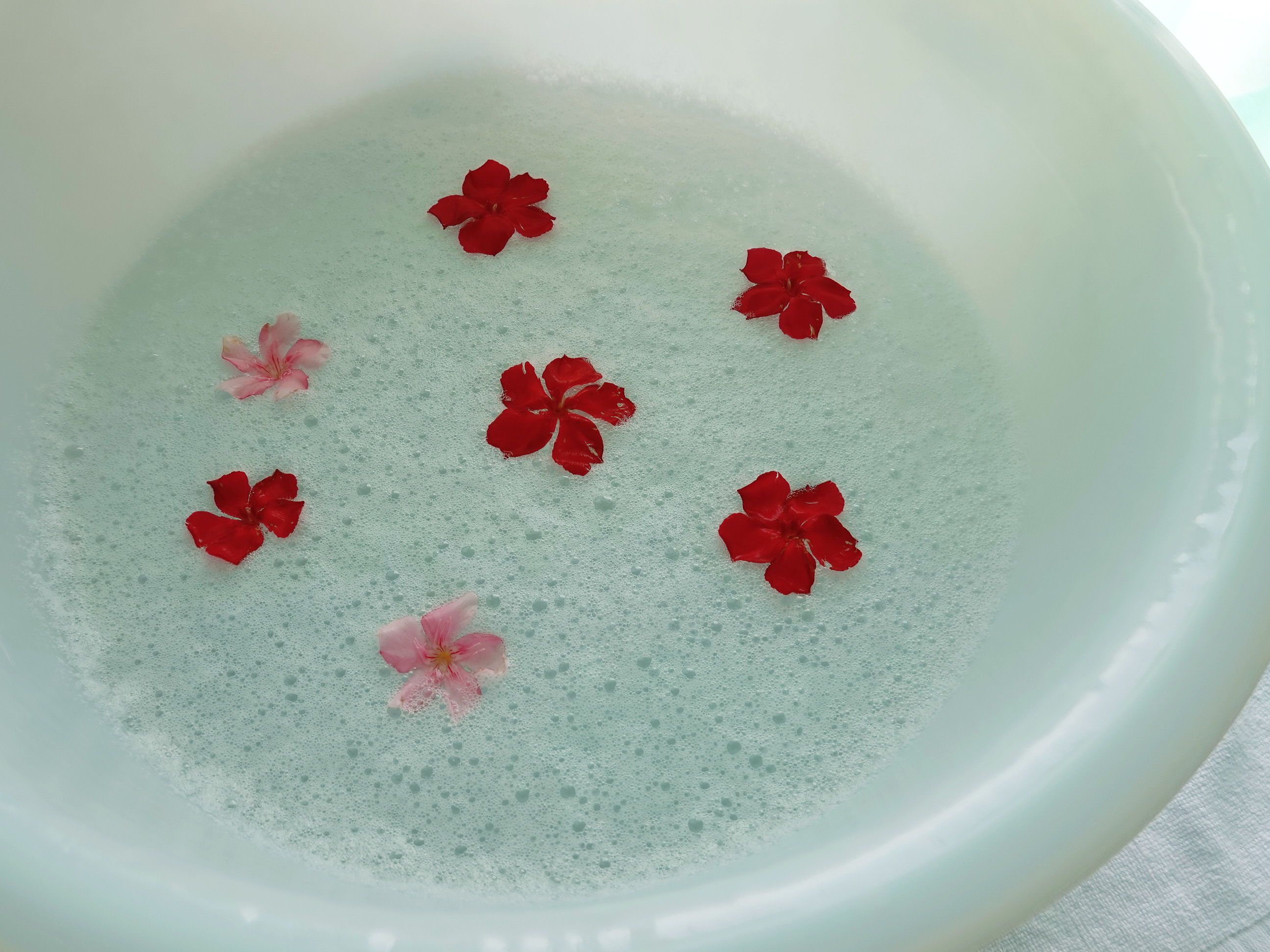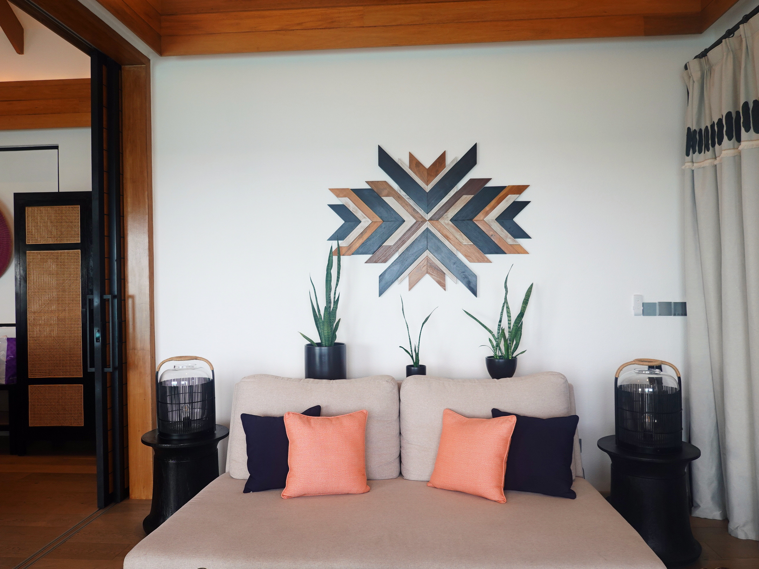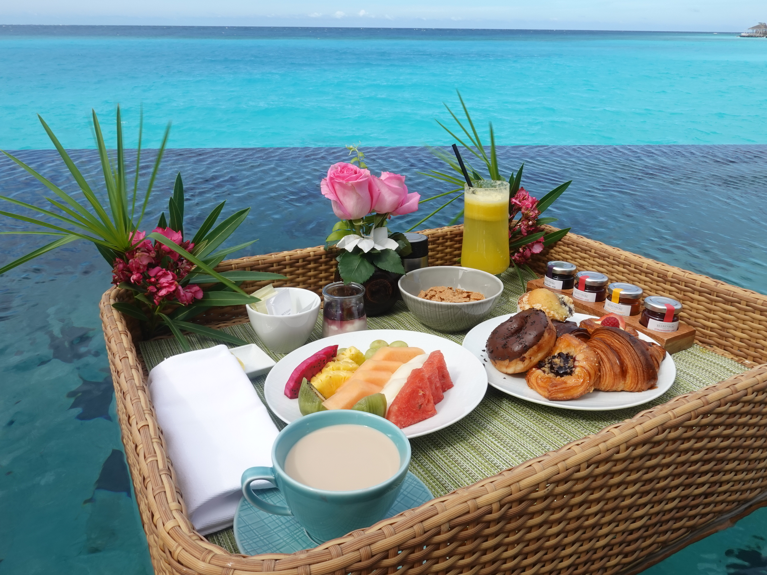 别墅内的泳池漂浮早餐非常值得一试,竹编托盘里色泽诱人的现烤面包、热带水果和鲜榨橙汁摆放在红色夹竹桃枝叶间,与蓝色大海一起像是打翻了夏日调色盘。
