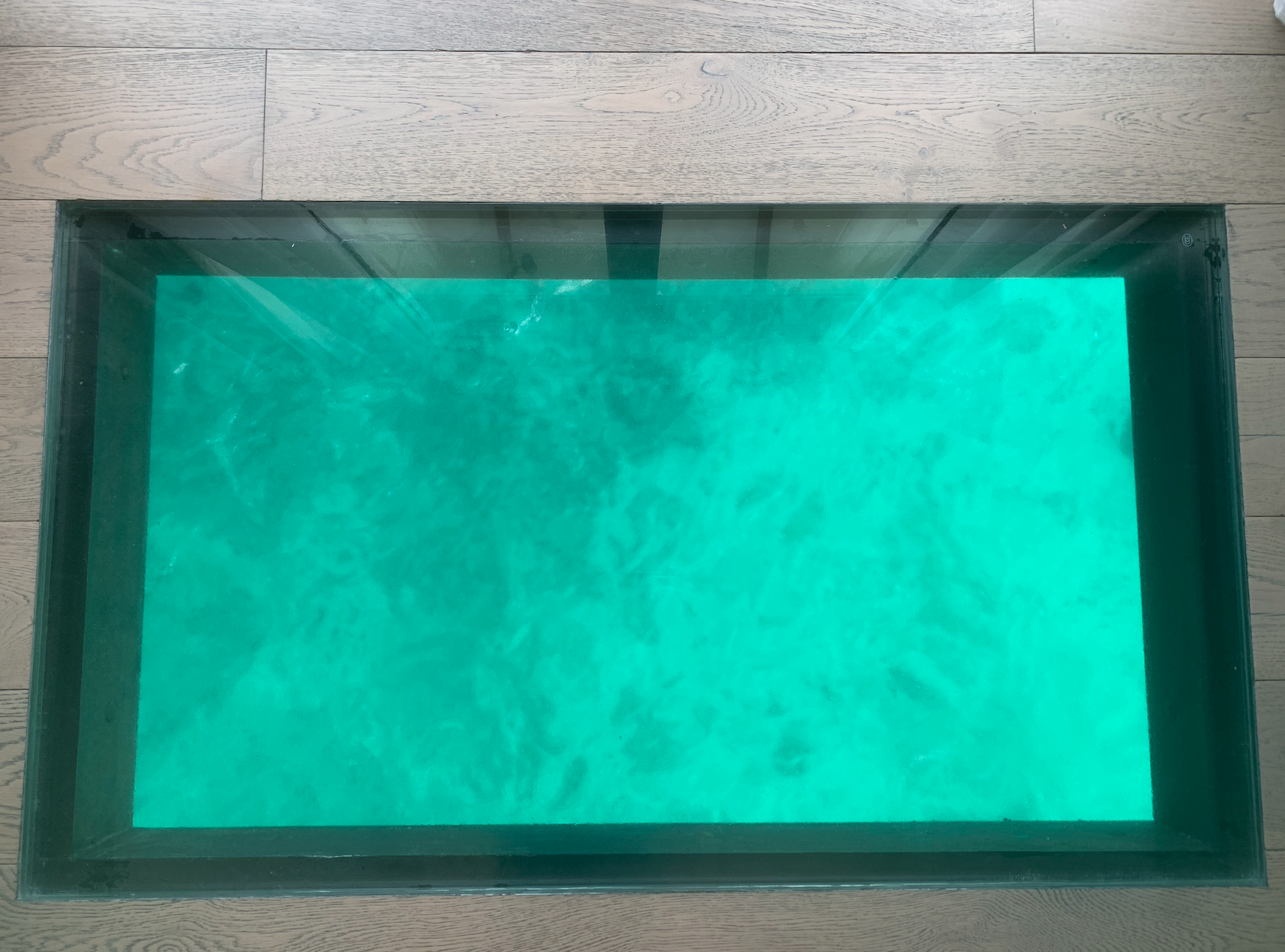 在别墅内部,木质和藤编元素在衣柜、地毯、茶几、墙饰等空间大量运用,岛屿生活氛围浓郁,踏入其间便能感受到轻松愉悦的热带风情。起居室、卧室和浴室的三扇全景玻璃门,让人身处室内的任何区域,都能将一览无遗的海景收入眼底,居住空间在不吝啬洒入的自然光线下显得活力十足。最令人惊喜的是,起居室和卧室地板各有一块长方形玻璃地砖,不出屋子就可以随时看到嘴上长“尖刀”的针鱼游来游去,还幸运地遇到了魔鬼鱼上门拜访!