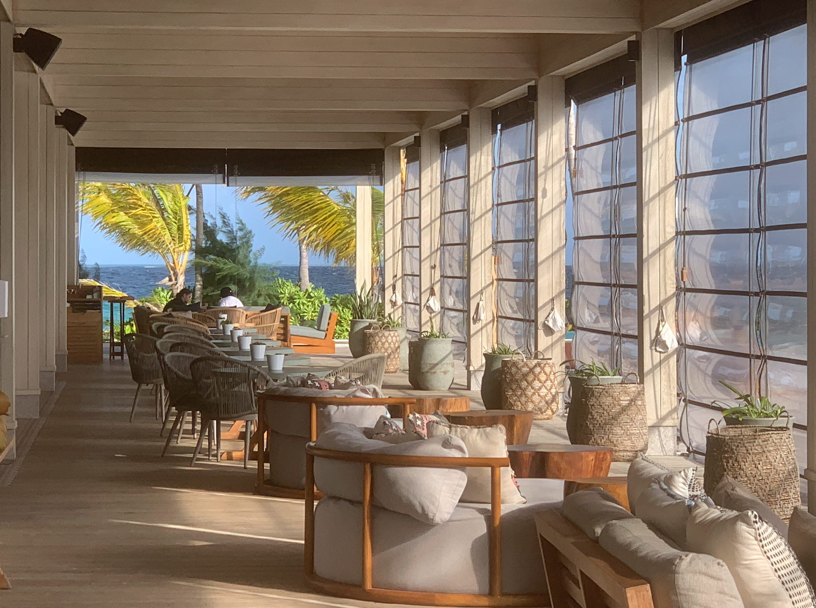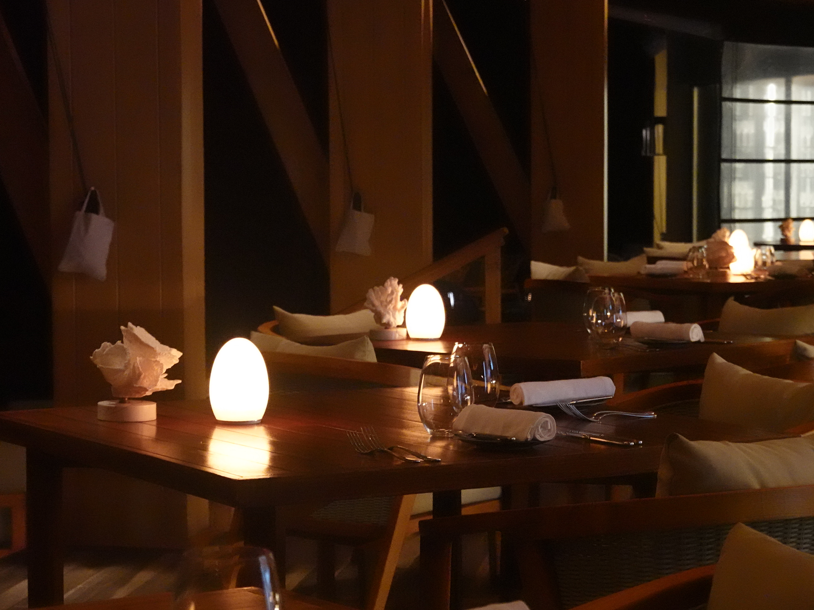 水上餐厅Origin位于度假村的西南一隅,只供应晚餐,主打特色海鲜。餐厅四面环海,桥下肆意游动的鱼群很难不让人联想这里是否是“from sea to table”。实则Origin实践可持续性海鲜采购计划,不会因过度捕捞扰乱海洋生态系统。餐厅选用当地生产的有机食材,在食材采购与烹调上避免浪费,主菜份量豪迈,龙虾皆是整只呈现,不愧是靠海吃海的地界。
