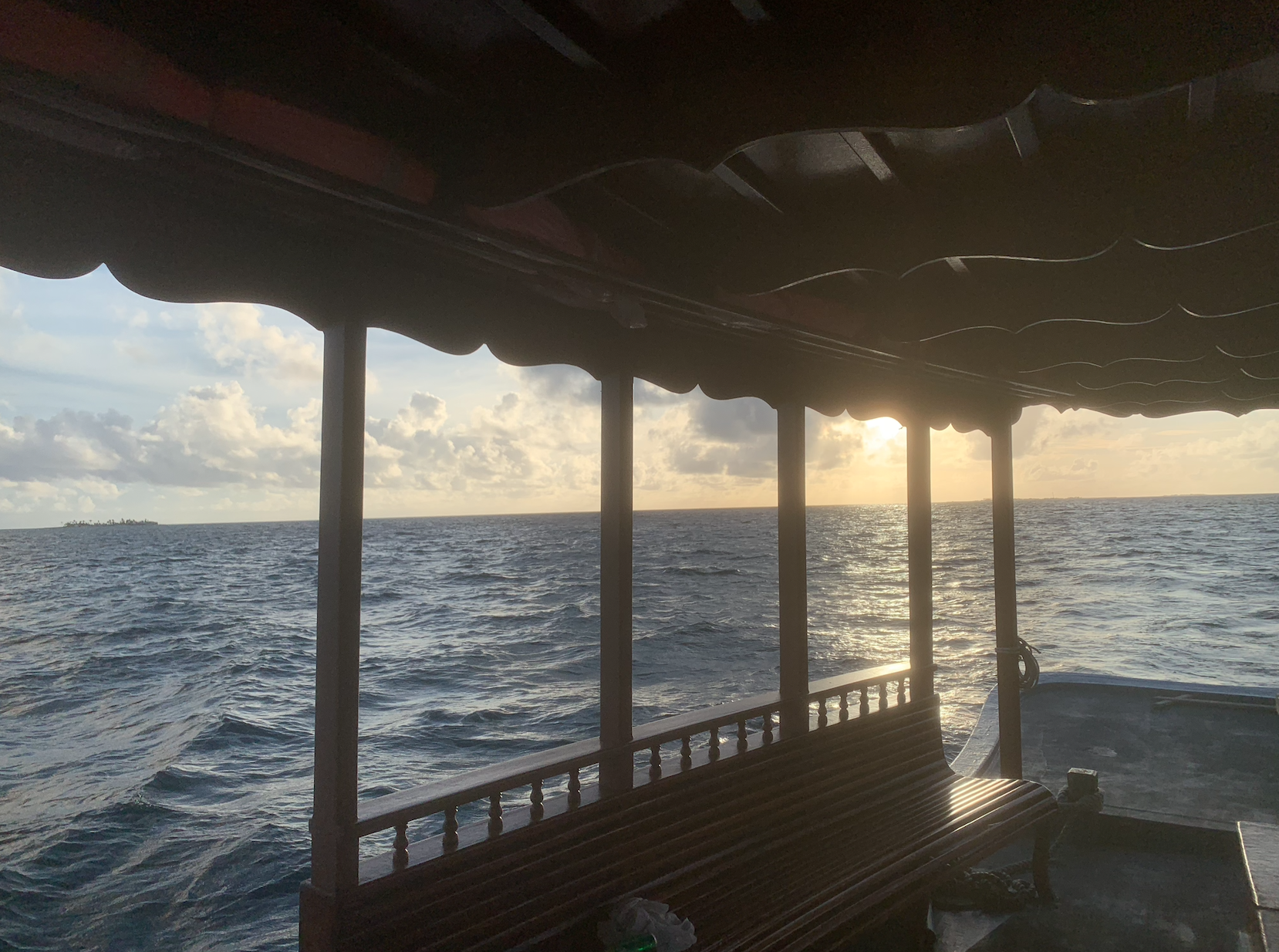 如果只能选择一项海上项目,落日游轮当仁不让。太阳下山前,潜水中心提供马尔代夫传统多尼船出海的体验。多尼船亘古以来是当地群岛间的交通工具,更是原住民所赖以维生的捕鱼船。船首的弯月造型独具一格,是马尔代夫手工艺家的代表性作品。在海上巡驶,可以用另一种视角打量阿敏吉里,满天的霞光、海面的余晖皆可拥抱入怀。(+0.1)