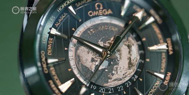 欧米茄海马系列Aqua Terra世界时钛金属版本,相比之前的钢款钛金属版本佩戴更加舒适轻便,而且表盘也是采用了一个全新的工艺叫做“激光烧蚀技术雕刻而成”表盘上是从北极俯瞰地球的精致图案,而且还会呈现出不同的颜色。