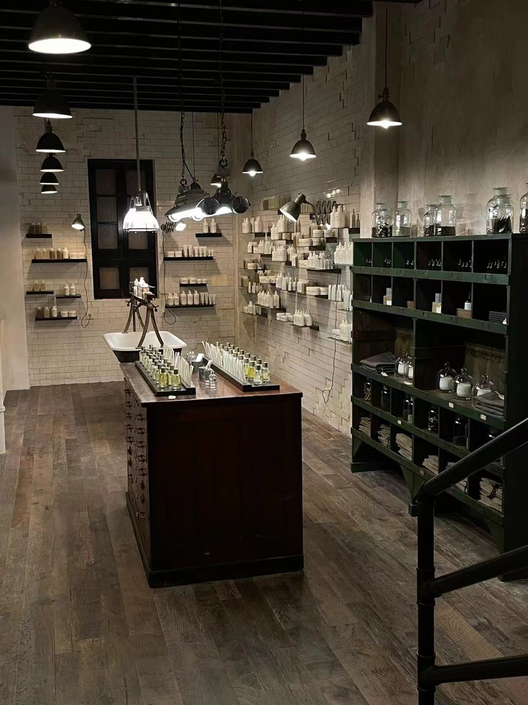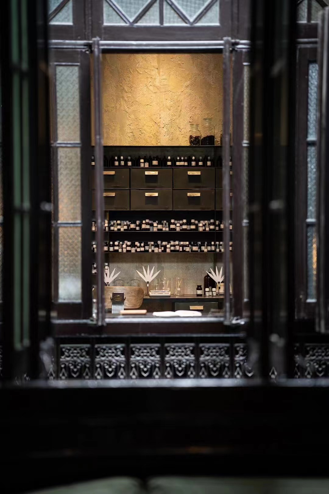 进入石库门的天井,首先印入眼帘的是传统乌漆木门和窗花,配以翻修的彩色玻璃。走进店内,到处都是带有时代气息的中古家具。一楼,LE LABO陈列了该品牌的经典香水产品、身体护理产品,以及可供顾客洗手体验的水槽。