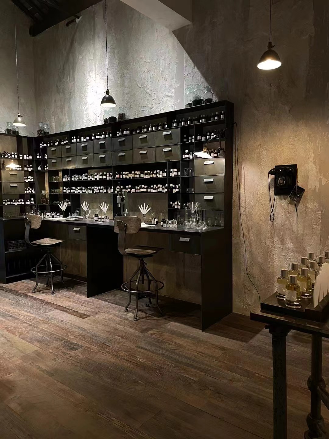 移步至二楼,LE LABO将这一层的布置重心放在了展示与休憩区域。该品牌复刻了调香师工作台,陈列了带有原料标签的香精油和调香工具,以还原调香师工作的场景。