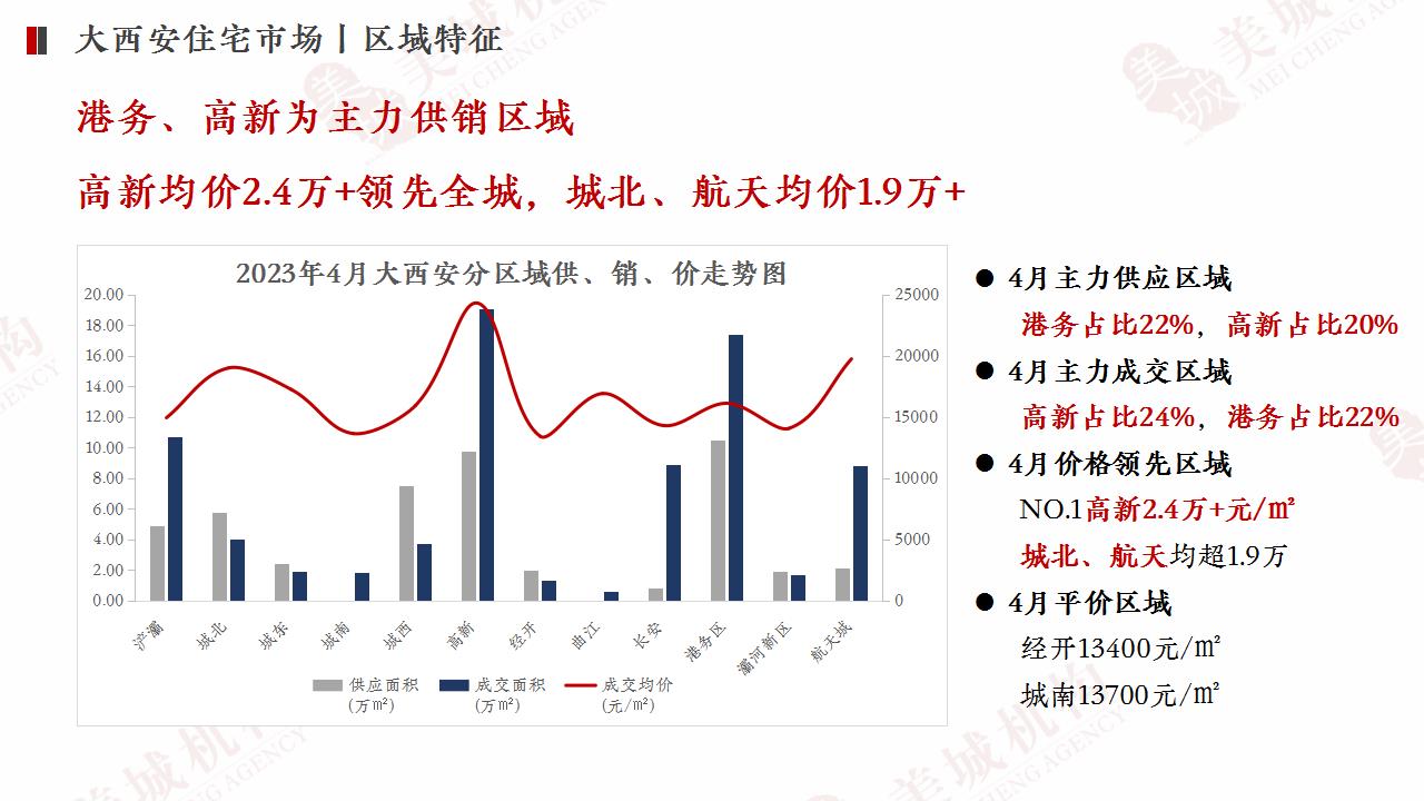毫无疑问,港务、高新依旧是主力供货区域;更确凿无疑的,是高新的标杆地位。4月份,高新均价2.4万/㎡+领涨全城,是名副其实的NO.1。