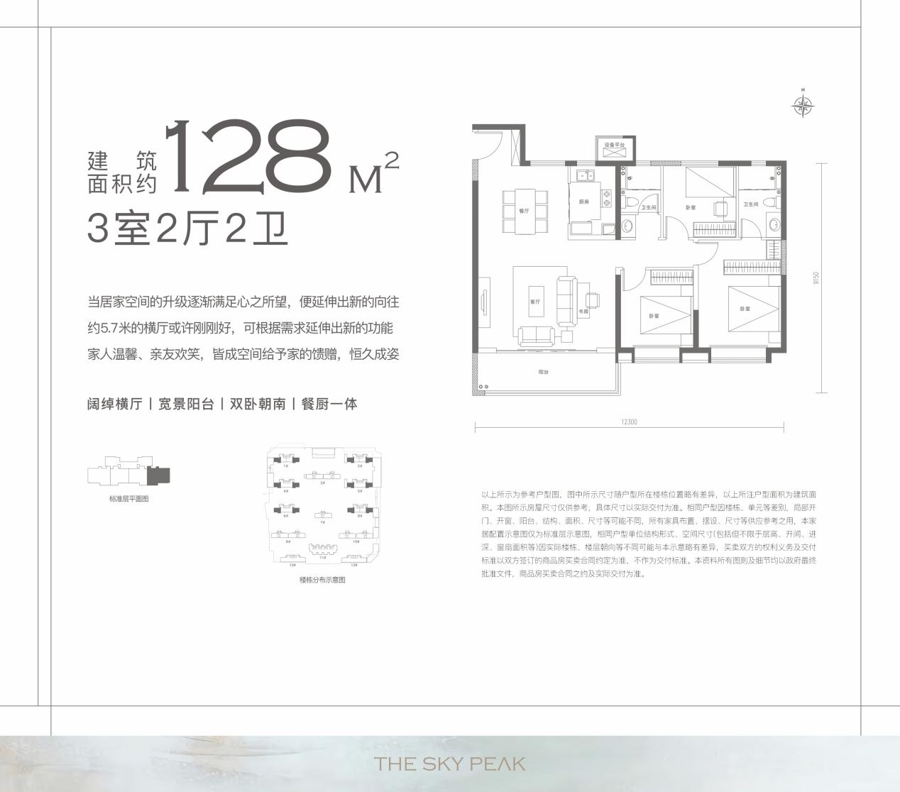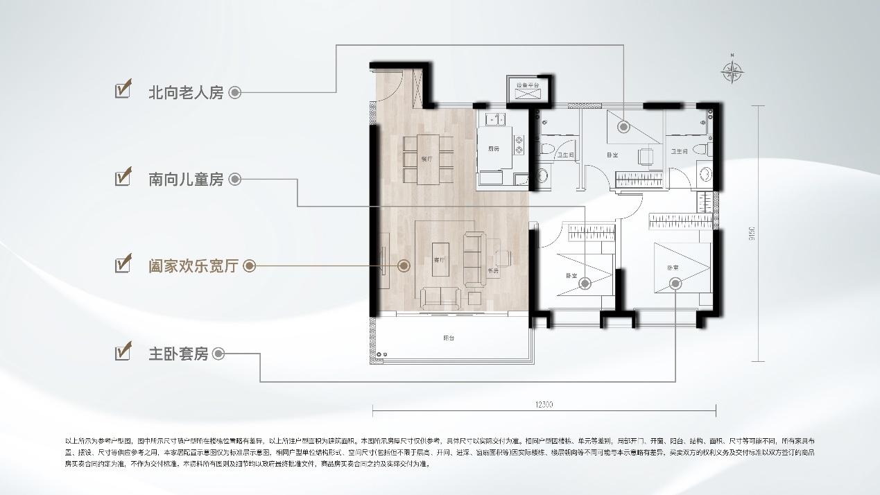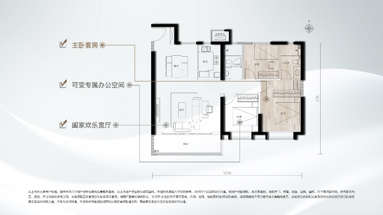 (1)功能性和舒适度兼顾 三开间、两卧室朝南,南向面宽约12.3m,LDKG一体化设计,5.7m大方厅,270°观景大阳台,套房式主卧,每一个细节的把控,保证了功能空间的同时,还兼顾了居住舒适度。
