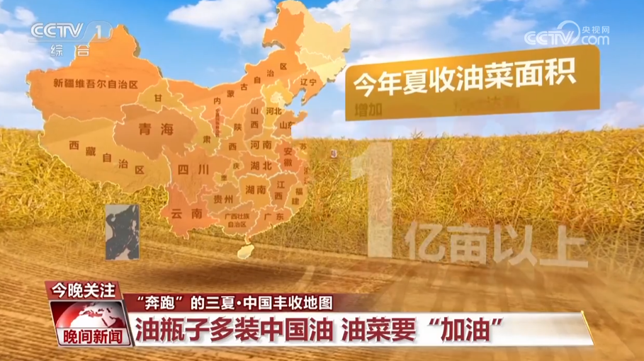 作为国内主要食用油源,油菜籽的加工技术也在提升。镰刀割菜、摔打脱籽的传统收割方式,逐渐被智能机械化替代。一台收割机能先后完成脱粒、粉碎油菜果壳和秸秆以及喷撒还田的全流程,还大大降低了菜籽丢损率。传统人工收割一天只能收一亩,机械收割一天能收60到70亩,也就是说,一台收割机相当于至少60个劳动力。不得不感叹,农业现代化,真香。今年夏收,油菜面积预计达到1亿亩以上,增加1000万亩左右。为了我们的“油瓶子”多装中国油,中国油菜要“加油”。