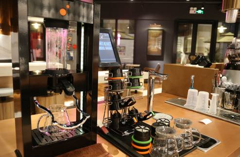 从点单区面前的一块黑板开始,如果你有兴趣,店员会超积极地告诉你制作流程:而后面酷炫机器就摆在那里,如果你点到了相应饮品,就可以清晰看到它们是如何运作的。