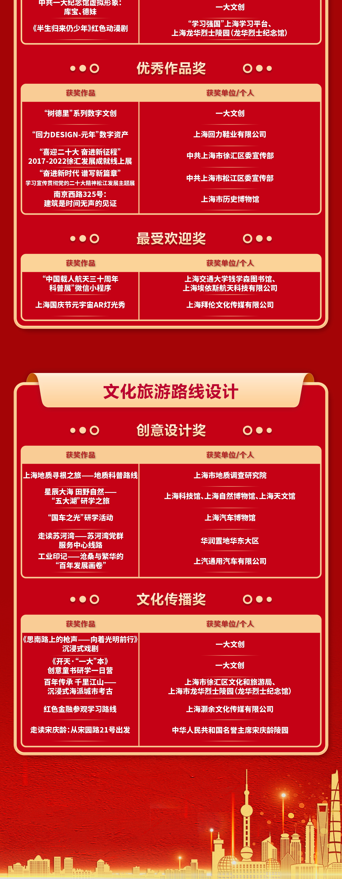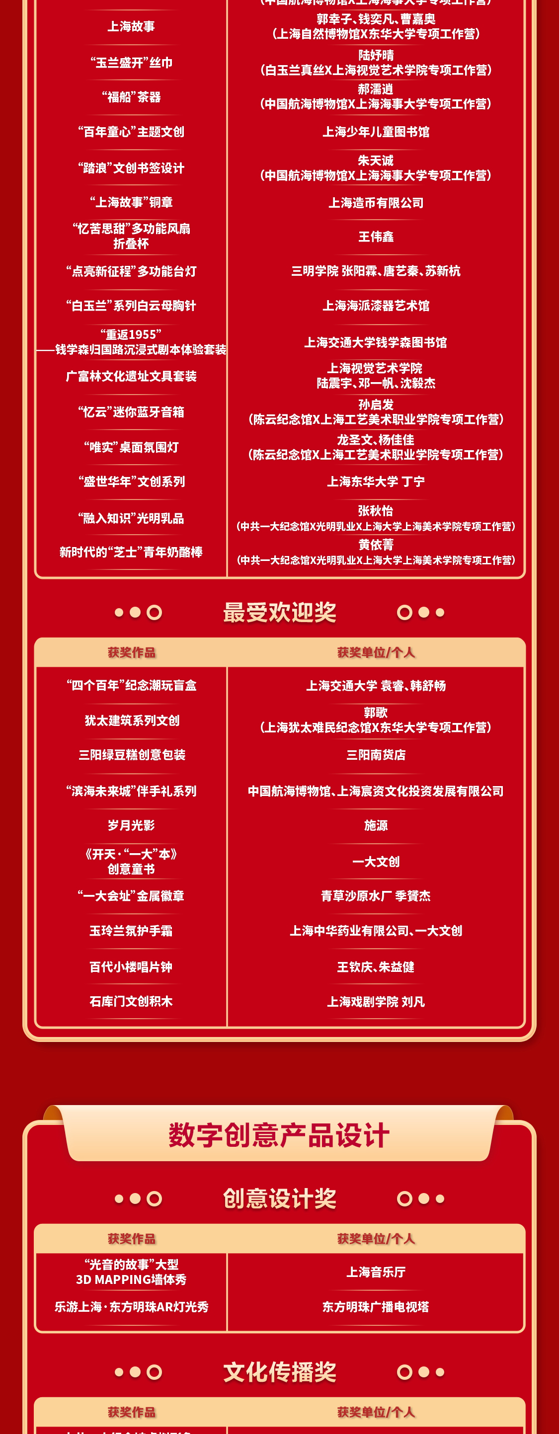 最终,经初评、复评及文化传播组和创意设计组终评,在文化创意产品设计作品中评选出创意设计奖5名、文化传播奖5名、优秀作品奖20名和最受欢迎奖10名;在数字创意产品设计作品中评选出创意设计奖2名、文化传播奖2名、优秀作品奖5名和最受欢迎奖2名;在文化旅游路线设计作品中评选出创意设计奖5名、文化传播奖5名。