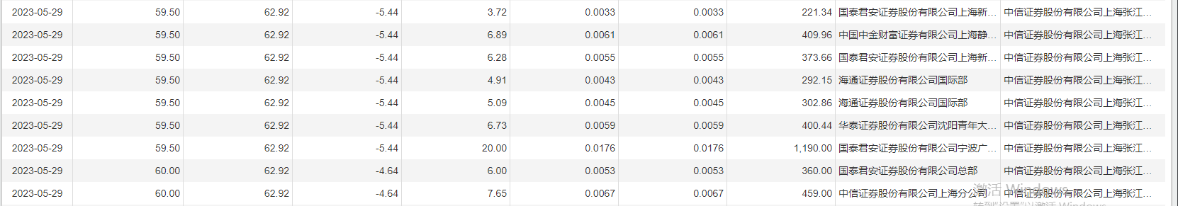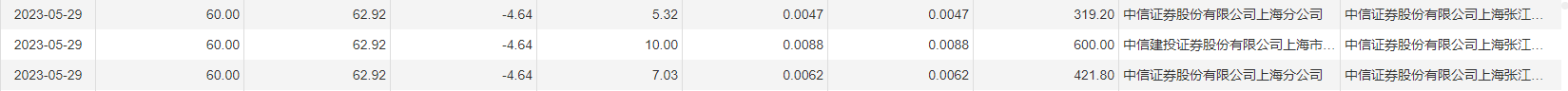 澜起科技5月29日大宗交易成交165.94万股,成交额9888.72万元,占当日总成交额的5.49%,成交均价59.59元,较市场收盘价62.92元折价5.29%,其中最高成交价60元,最低成交价59.2元。