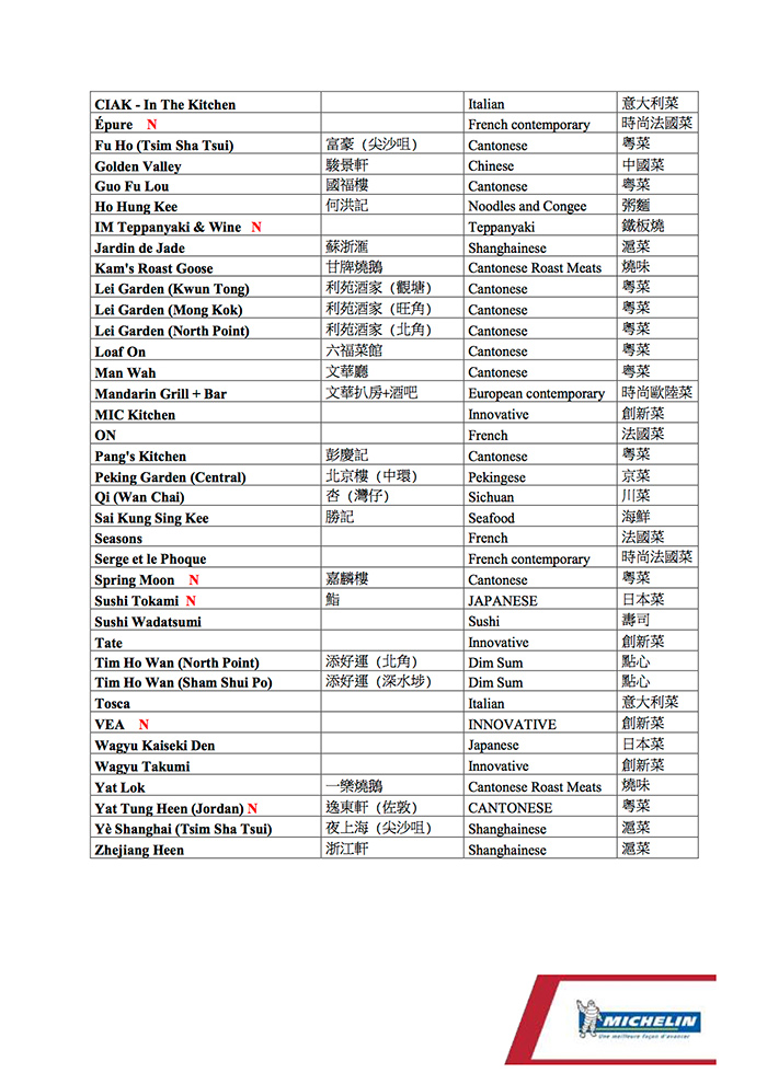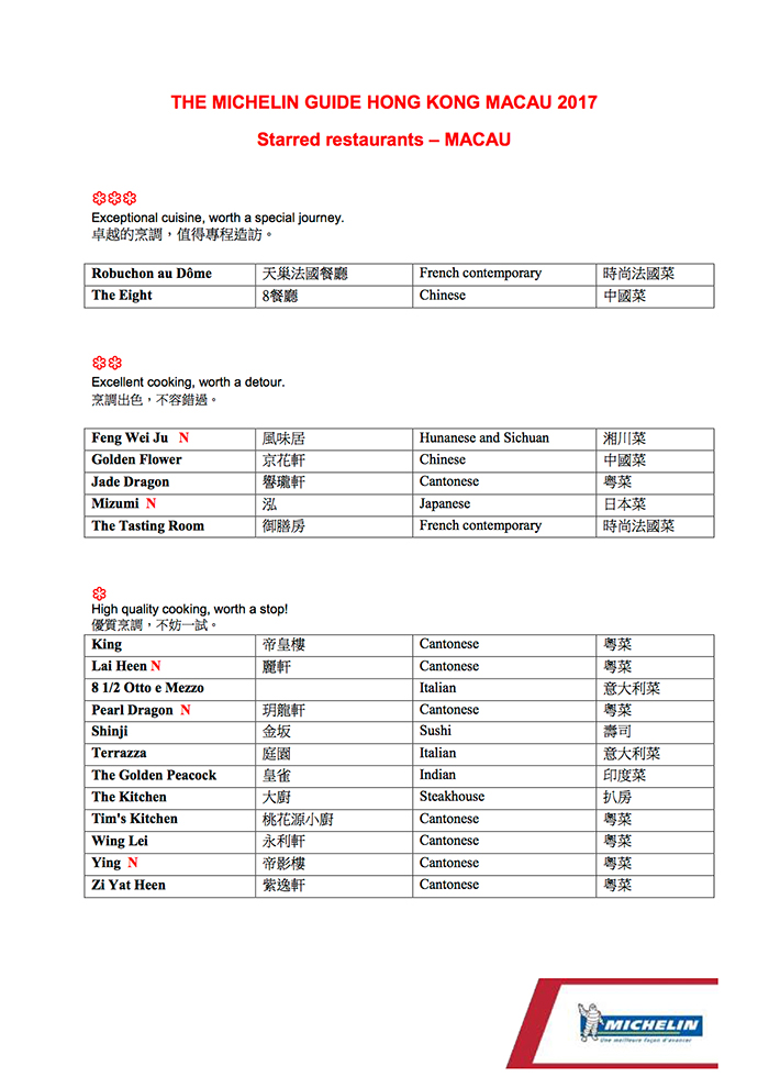 以下是《米其林指南 香港澳门2017》的详细榜单: