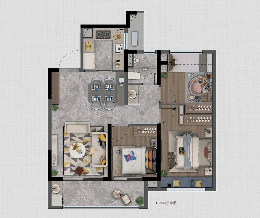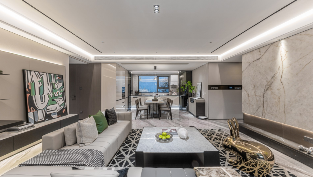 客厅约5.7米横厅设计,配上LDK一体化中西双厨三厅联动+约8.7米宽景阳台。
