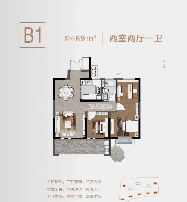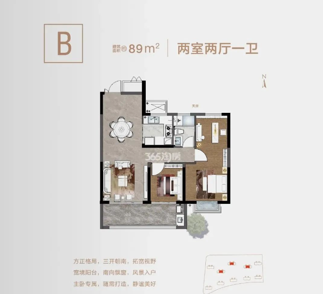 南向约15.75米面宽,做到3房朝南,其中两套房设计,主卧开间足足有约3.9米,几乎超南京多数小户型的客厅尺度。
