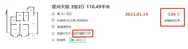 从链家的信息来看,起初该套房源的挂牌价为595万,最后降价69万后成功卖出,成交周期仅15天。