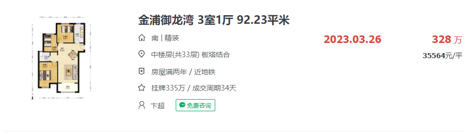 最近一次成交是今年3月26日,建面约92.23㎡的四室两厅大户型,成交总价328万,成交均价约35564元/㎡。