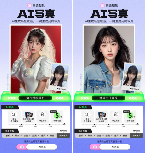 截至目前,美颜相机共推出复古婚纱写真、清冷肖像照、职业形象照、美式证件照、韩系牛仔画报等6套“AI写真”效果。