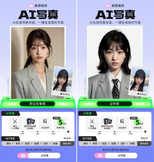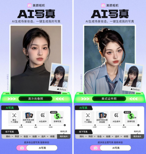 对比线下写真流程,美颜相机“AI写真”通过AI技术,降低写真门槛,不需要妆造置景和灯光,随时随地都能出片。