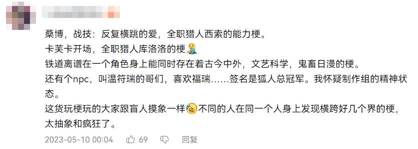 此外还有“叔叔我啊,真的要生气啦”“你们不要再打啦”“人类的本质是复读机”等网络热梗统统被融入游戏当中,构成了诙谐幽默的文案风格,在年轻玩家之间相当受欢迎。别看大家嘴上说着“米哈游为了玩梗做了个游戏”,游戏相关二创中最火热的也是梗合集。