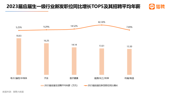 从应届生职位增长情况来看,与2022届相比,增长较明显的TOP5一级行业为能源/化工/环保、医疗健康、汽车、机械/制造、电子/通信/半导体,其中能源/化工/环保同比增长为42.30%,增速最高。在上述行业中,应届生招聘平均年薪最高的是电子/通信/半导体,为18.83万,也领先所有一级行业。
