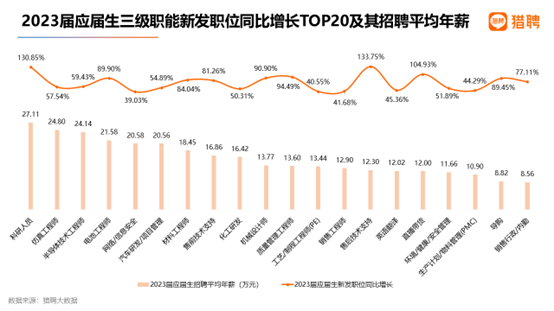 分职业来看,2023届应届生新发职位同比增长最多的三级职能TOP20中,售后技术支持、科研人员、带货直播位居前三,增长率为133.75%、130.85%、104.93%。