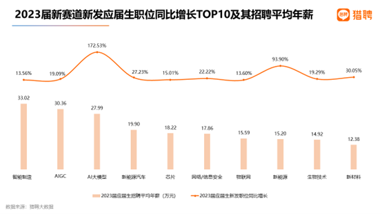 此外,作为新的经济增长点,多数新赛道就业增长之势势不可挡,具有强大的纳才空间。其中,AI大模型应届生职位同比增长超170%,新能源、新材料位居第二、第三,同比增长93.90%、30.05%。