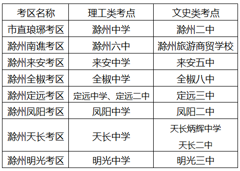 市直两区高考考点设置在滁州中学、滁州二中、滁州六中和滁州旅游商贸学校。