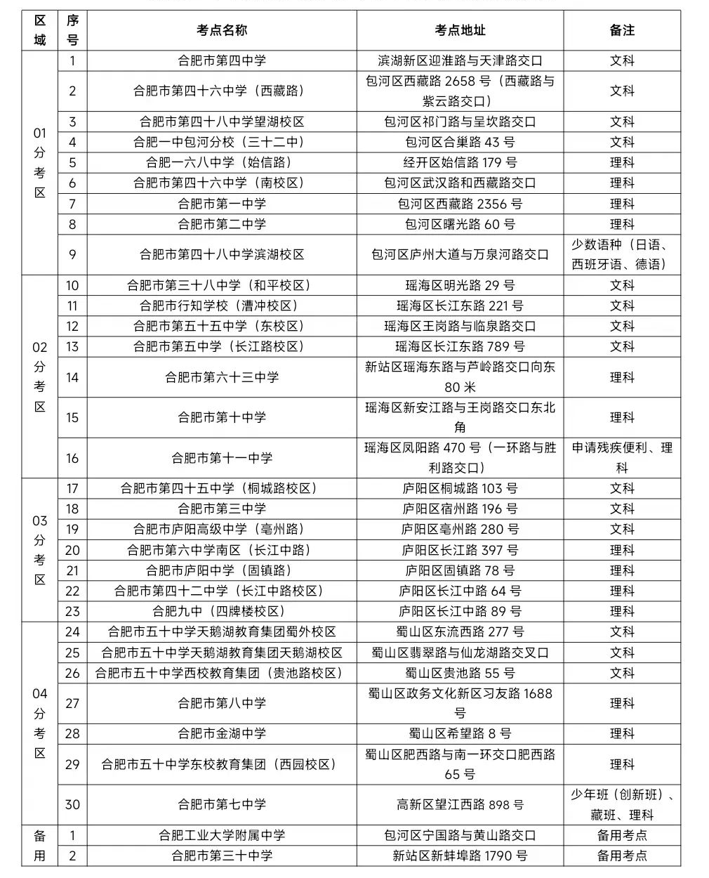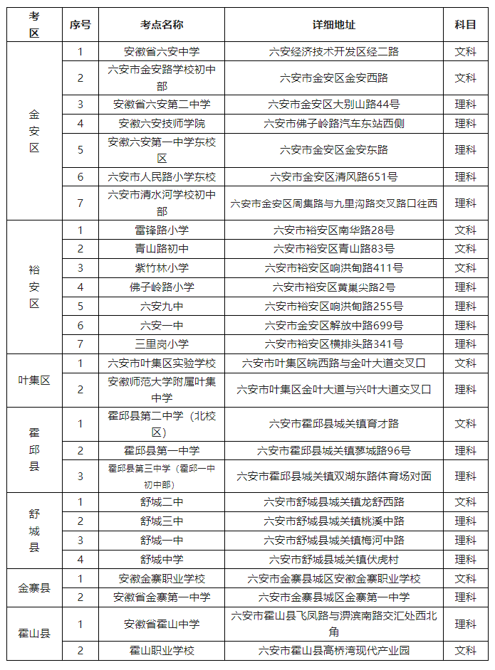 无为市:共设五个考点,分别为安徽省无为中学、安徽省无为第二中学、安徽省无为第三中学、安徽省无为第四中学、安徽省无为第三中学城北校区。